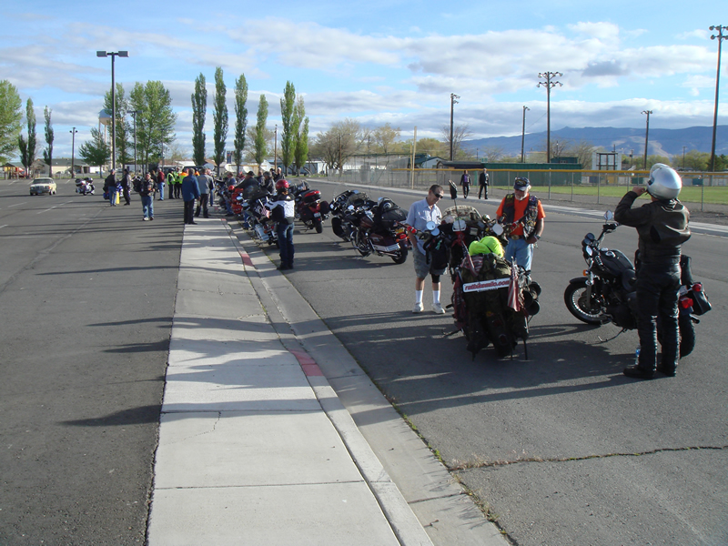 We rode over to the school for the morning riders meeting. Had the normal 50/50 drawing. That money is for fuel for the chase truck, and the other half goes to the winner. It is usually donated back to the fund. So far, only one person had donated their winnings back.