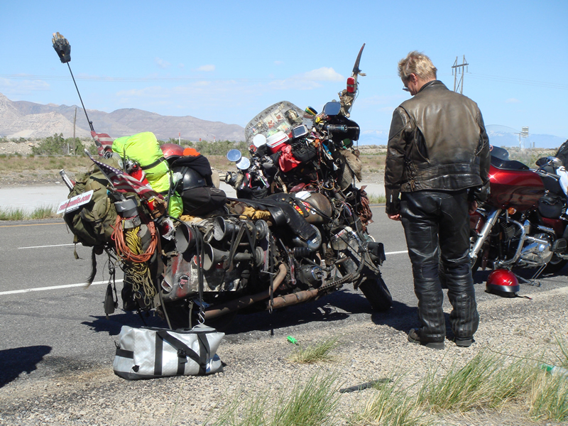 Meanwhile, the chase truck had blown out a spark plug back in Wendover. Headdog stayed back to try to help them with it. All he could do was shut off the injector to that cylinder. Steve then took off to catch up to the pack. He was doing 90-100 mph most of the way. He stopped where we were and said he was almost out of gas. I dumped the gallon that I carry with me into his bike so he could make it. Shortly after that, the chase truck came by and I told them to keep on going, that I had help on the way. They said that was good, ‘cause the way the truck was running, it probably could not handle all the extra weight.