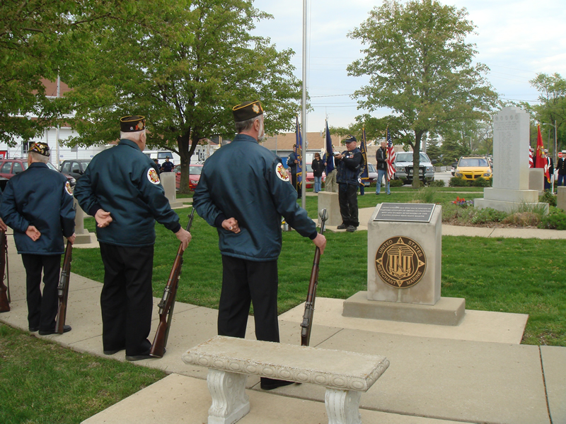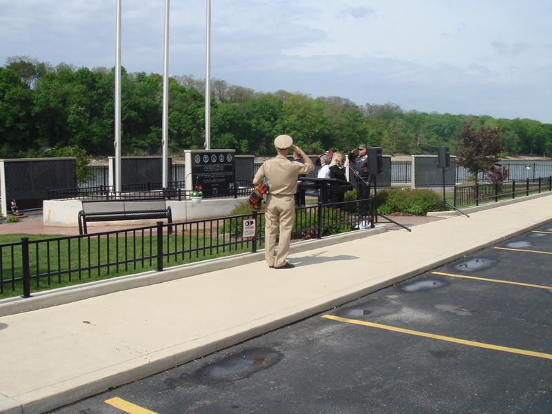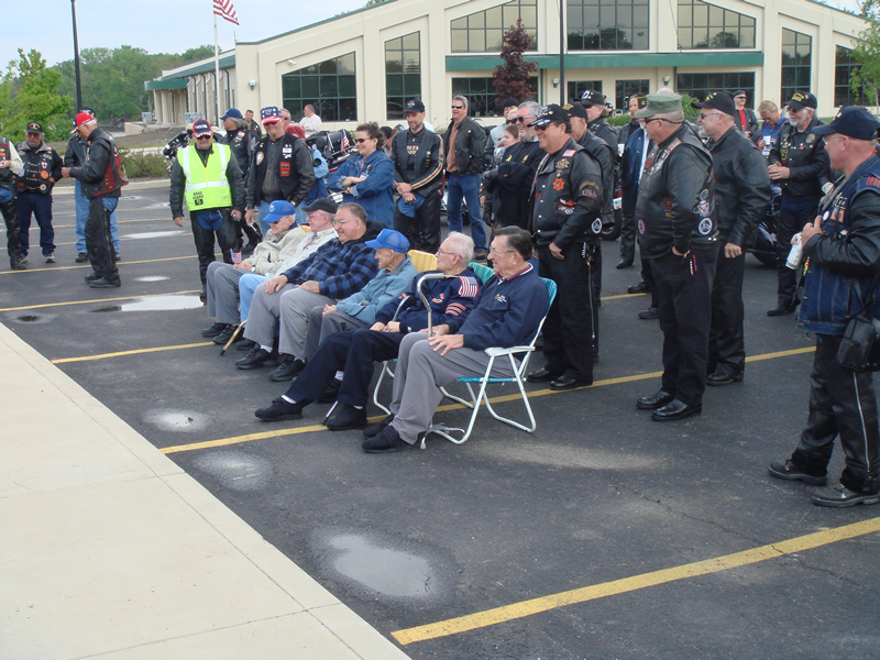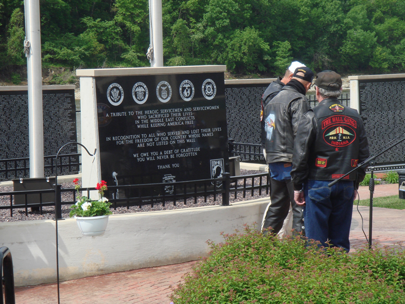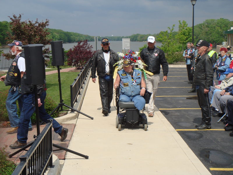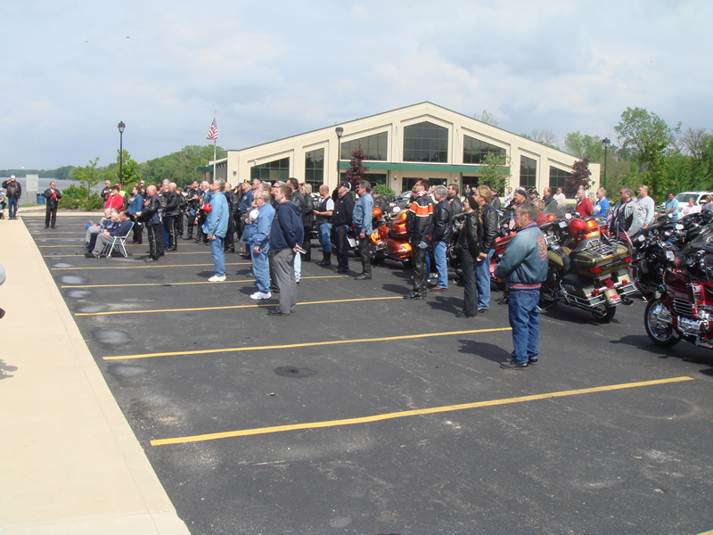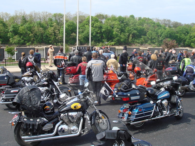 The first leg was 112 miles to Marseilles Illinois. We arrived to a very warm welcome. The chief of police, Jim, who gave me his name tag off his uniform last year, was very happy to see the good old rat bike back again, along with Joni & I. They had a very good ceremony at the Middle East Conflict Wall, along with a wreath laying ceremony by people from our ride. We visited with the Mayor and a lot of other fine people, who all do a lot to maintain the beautiful wall. It is very sad to know that there are over 4,000 names on the wall and more waiting to go on there. A lot of our young guys died for our right to be a free country. The setting on the Illinois River is fantastic. They take a lot of pride in the whole scene, as they should. We had a police escort all the way down the highway and into town, and out as well.