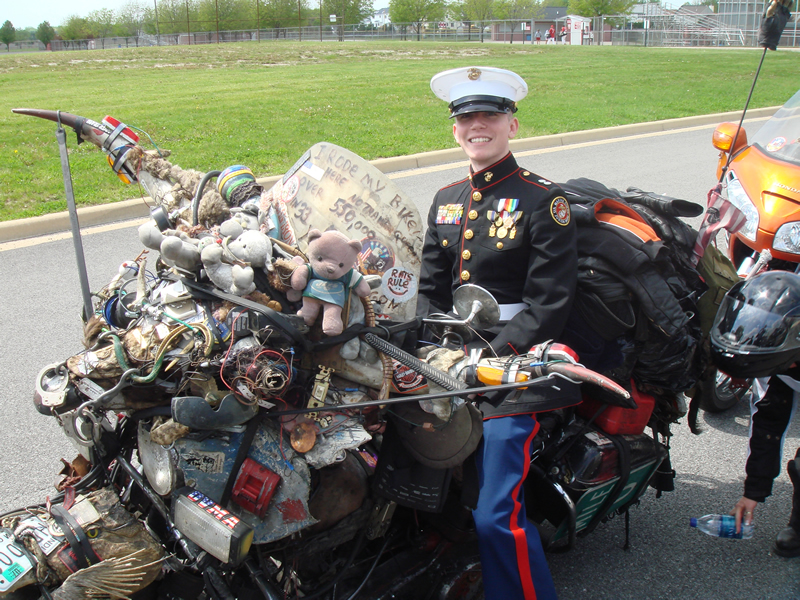 19 miles later, we arrived in Morris for fuel and a wonderful lunch and lots of cookies put on by fellow riders of Illinois. Our police escort guys on bikes, also had lunch with us before we hit the road again. We then rode another hour and a half to Portage High School in Indiana. We were treated to a demonstration of the Jr. ROTC Cadets. They were flinging their rifles around like majorettes twirl around batons. The Cadets did a couple of demonstrations, with only a couple of “oops.” The whole program was very amazing ‘cause a lot of adults couldn’t do the things that they were doing. We were introduced to the senior members who were soon to enlist in different branches of the service. One of them was Jason Follow, who I met in the parking lot by my bike. I got a picture of him & me standing next to my bike. I was told that I would meet his aunt at our dinner stop at St. Joseph Club. I told him to sit on my bike for another picture. “That’s an order”, I said with a smile. Jason had a big smile on his face as well! I wished him well in his new adventure in the Marines. What a positive attitude he had, as well as the other kids on the drill teams. It was a pleasure to do that stop!
