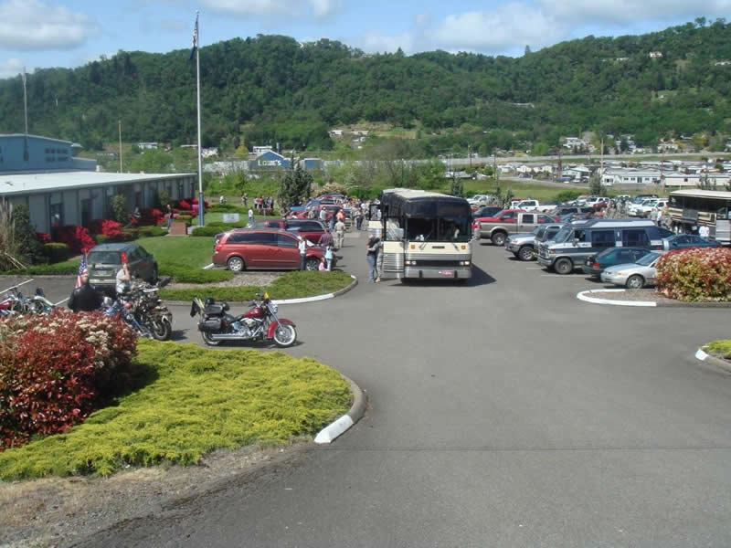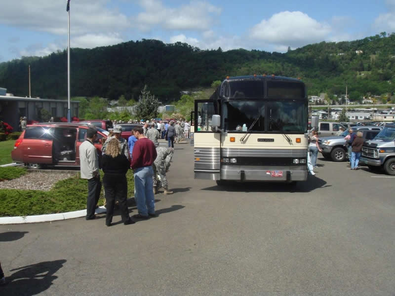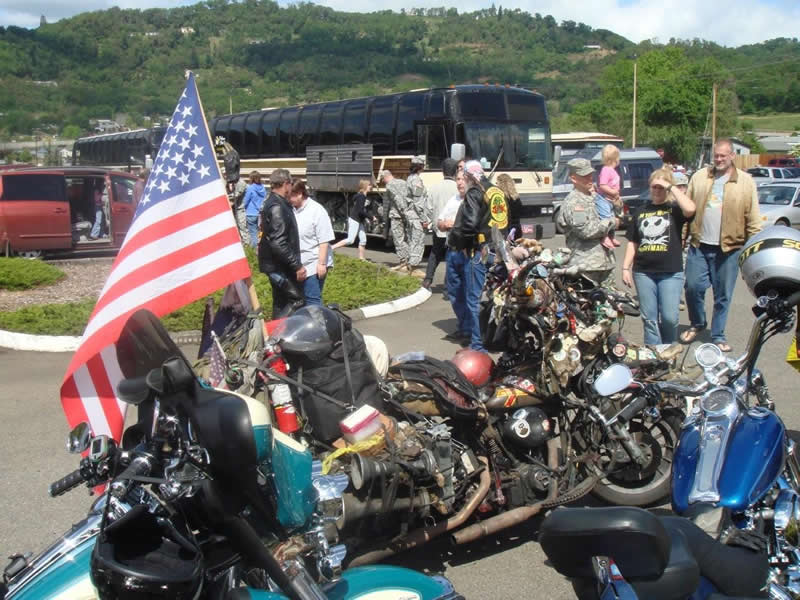 The day started at the Roseburg Armory. Our area was sending 130 National Guard soldiers off to the Medford Airport and then to Fort Benning, Georgia for a couple of months of training before being sent to Iraq. The Patriot Guard Riders were asked to help escort the three busses for the 100 mile journey to Medford. We had about 30 bikes for the send off. I got to the armory an hour early for the 11:30 departure time. I was able to talk to a lot of the guys and gals going over seas and thanked them all for their service to our country. I witnessed a lot of emotional goodbyes between family members and their kids.