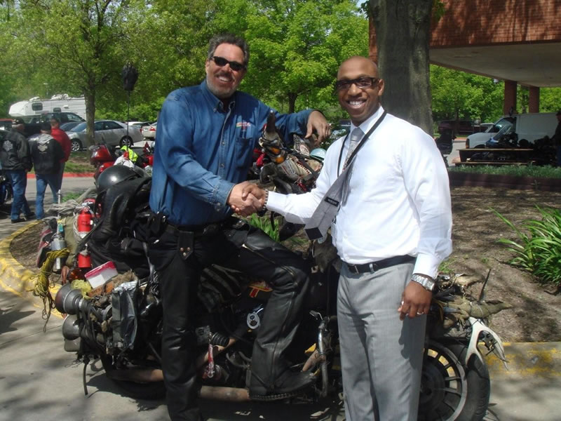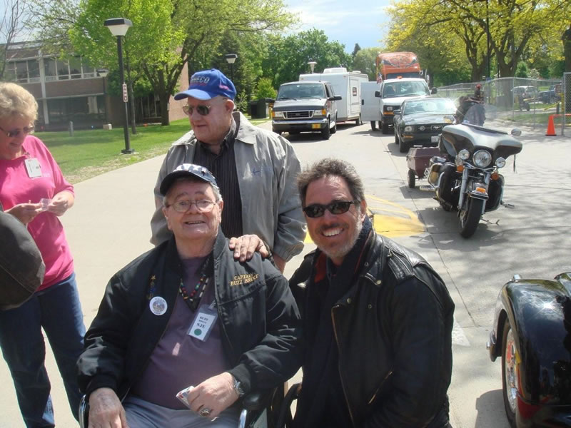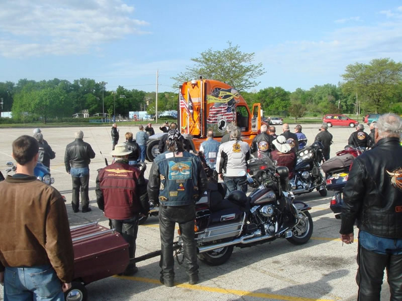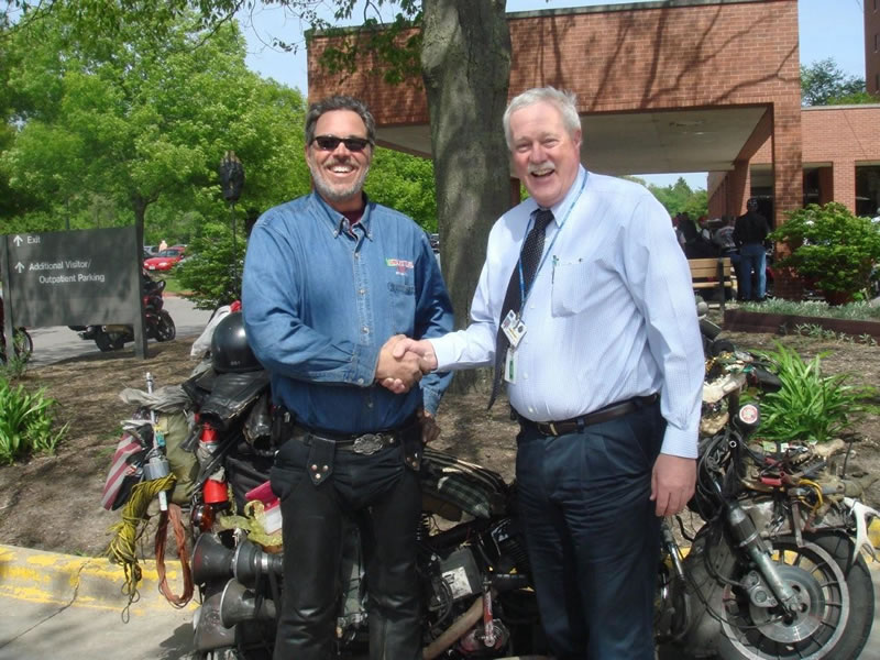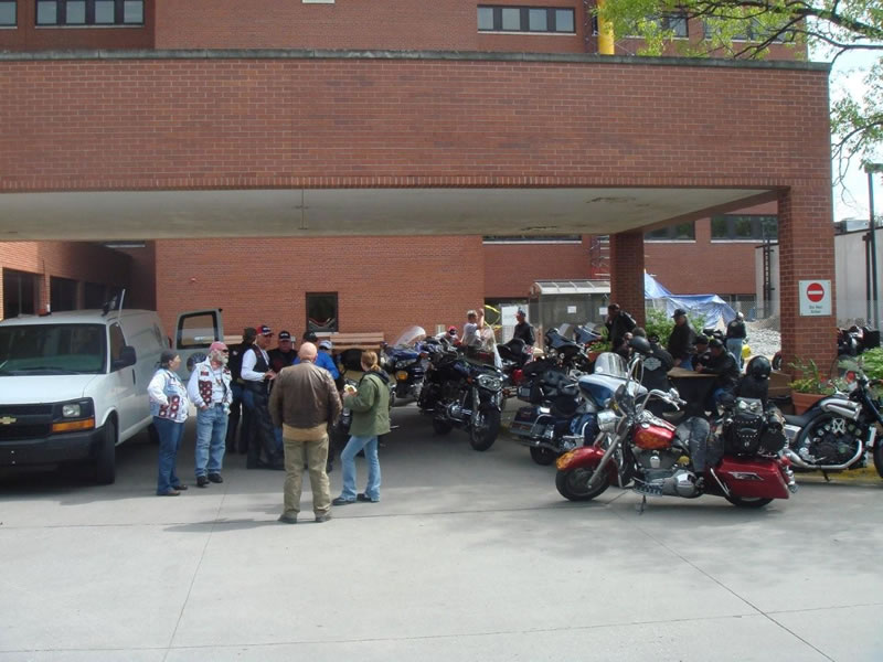 The wind was really starting to pick up a LOT! We hit another fuel stop shortly after we got back on I-80. The bikes looked like they were trying to fall over while they were parked the wind was blowing that hard. Lon’s wife Mary B got off their bike and got in one of the support rigs as did Jackie too. The wind was blowing into us directly from the south, trying to push us into the fast lane. We rode another 55 miles to Iowa City where we were picked up by a police escort to the VAMC for another visit with the veterans. Aloha's front shifter spline stripped out as soon as we pulled in and he could not down shift. I tried to take the rear one off to put it up front but it was Loctited too hard. The allen head was trying to strip out. We showed him how to shift using the back one only and he headed off to the Harley shop for the 2nd time on the trip. They got him fixed up. I met the Chief of Staff of the hospital, John Cowdery. He is standing by my bike and shaking hands with me. He said that he has never saw a bike like mine before. He was a very easy guy to talk to. A just out of the service new guy to the hospital is Nigel, who is also shaking hands with me by my bike. Ed (Silvertop) asked Lee Paterson if he wanted to ride the missing man formation. Lee said sure and was getting schooled on what his duties were to be. A Welcome group donated a few boxes of apples and bananas to our ride.