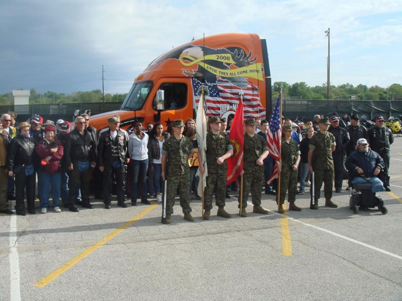 We rode over to a local school to greet kids who are in the Junior Reserve Officer Training Corps (JROTC). We were told that there were 1,000 kids in the school and that 200 of them are in the JROTC. They did a small demonstration of presenting the colors and then they all intermingled with us and thanked us for being there.