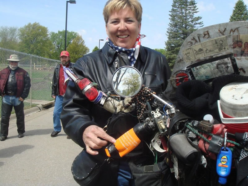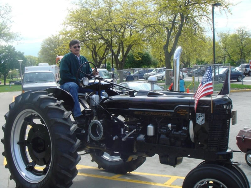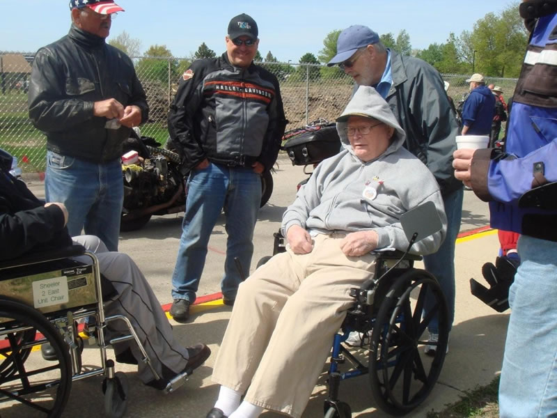 It was yet another chilly morning as we headed up to Marshalltown to visit at the State Veterans home. The sun was just starting to peek out at us after we arrived. I asked about CY, a resident for quite a while. Last year he was 103 years young, and we all looked forward to seeing him every year. It seems that last year was our last time to see him. He did not make it to 104. There were at least a half dozen resident veterans who asked me if I still had the same engine that I had to replace last year. They may be old but they remembered my engine swap story from last year! They were very glad that we came back again. We gave out a lot of pins and buttons and cards for them to have. They had a very good lunch waiting for us during our hour and a half stay there. Rhonda gave me a cooler cup holder from Iowa that I put on as my left handle bar grip. The last one of them had worn away. Rhonda is a local rider from Des Moines who has a very good looking black, low, bagger with awesome deep blue flames and lots of chrome. She was handing out cookies to every one as we were preparing to depart. All the riders from Des Moines were very good to be around and they all liked to have fun riding too. Too bad that they couldn't join us for more of the trip. We said good bye to the residents and some of the other riders who rode a short way with us before going their own way.