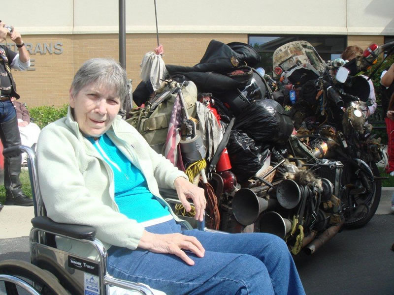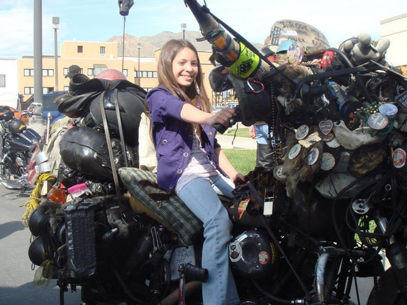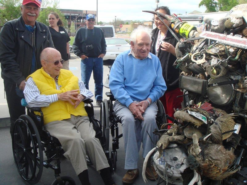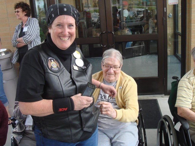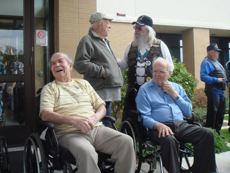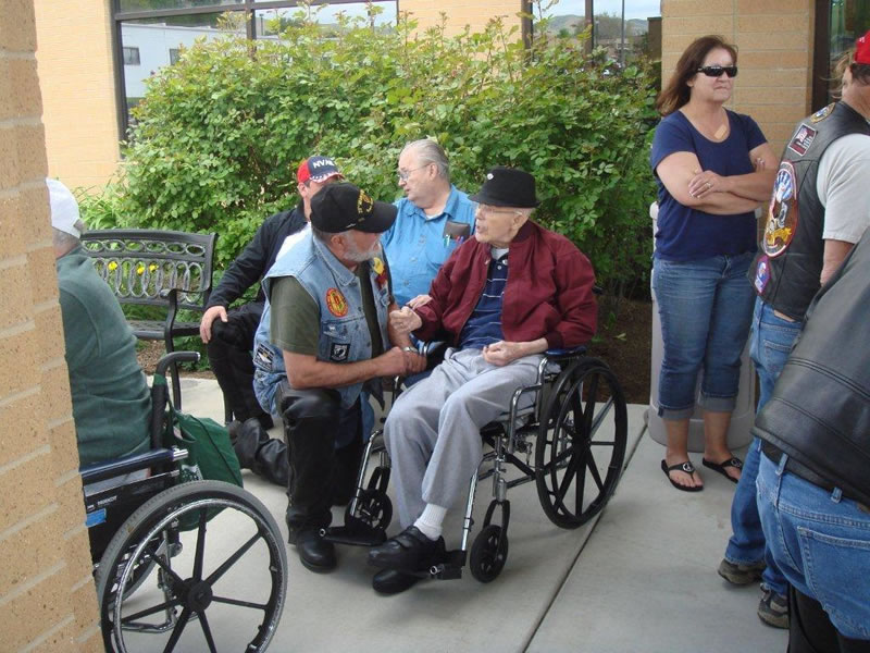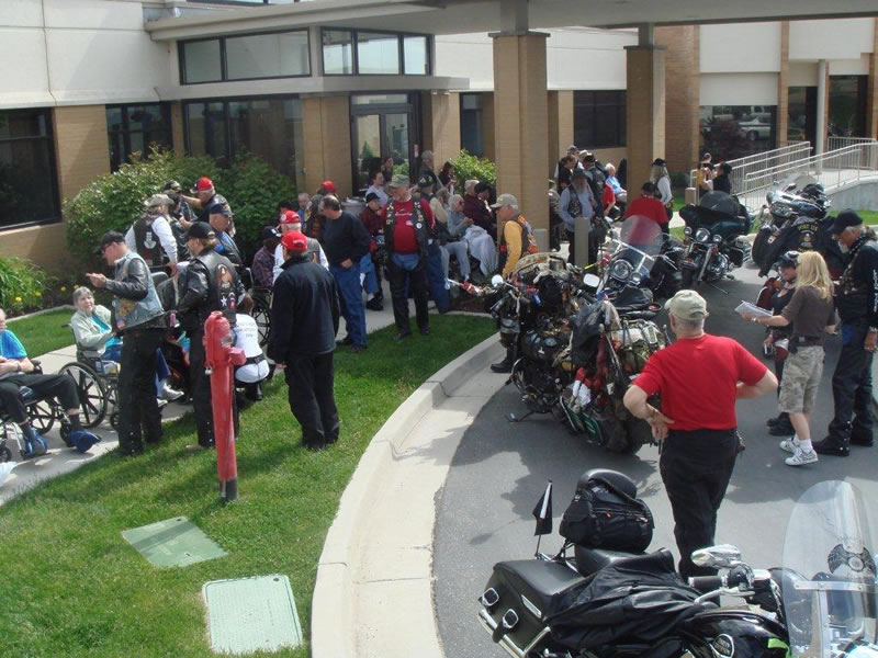 When we got to the Utah State Veterans Home, there were a couple of dozen patients eagerly awaiting our arrival. Most were in wheel chairs or on mobile beds that were propped up so they could see all the bikes. They were extremely happy to see us. I parked my bike next to the curb by them so they could have another reason to smile. I spoke to Ray first and found out that he was in the Army a long time ago and that he had been in this home for 3 years. Next to Ray was Curtis from the Air Force and he had been at the home for about a year. We talked about the Helicopters that he used to fly and his face was getting lit up with joy the more that he talked about what he used to do. What a rewarding feeling it is that just by listening for a few moments, it can mean the world to someone! Next I spoke with Lee & Bob as they were wheeled to my bike for some visual entertainment. I then went up to a gal whose name is Gerri. I asked her how long she has been here and she looked very puzzled and finally said "I don't know". An aide said that she has been here about a week. A guy yelled, "hey Oregon" to me so I went to speak to him. I ALWAYS have an Oregon Tool & Supply shirt on so I recon he was talking to me! His name is Delbert and after I told him my name he insisted on calling me "Anderson". He was a very personable fellow. He told me about how when he was 9 years old on Dec 8th 1941, his town in Utah only had 3 guys left in town between the ages of 18 & 45. They had ALL enlisted after Pearl Harbor (as my dad did too on that date from his farm in South Dakota). He served in Korea and he remembered hearing a lot of WW1 stories when he was a boy. We talked about how there will soon not be any first hand stories of WWII. He said the guys are reluctant to talk about the war unless you get 3 or 4 of them together and then the stories come out. An 11 year old girl wanted to get a picture on my bike and I asked her if she had any relatives here. She said, "Just my mom who works here, but everybody is my friend here” as she gave a patient a big hug. The guy’s face lit up and I could tell right away that Aubrey is therapy all by herself! What a touching moment.