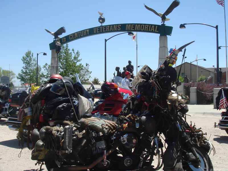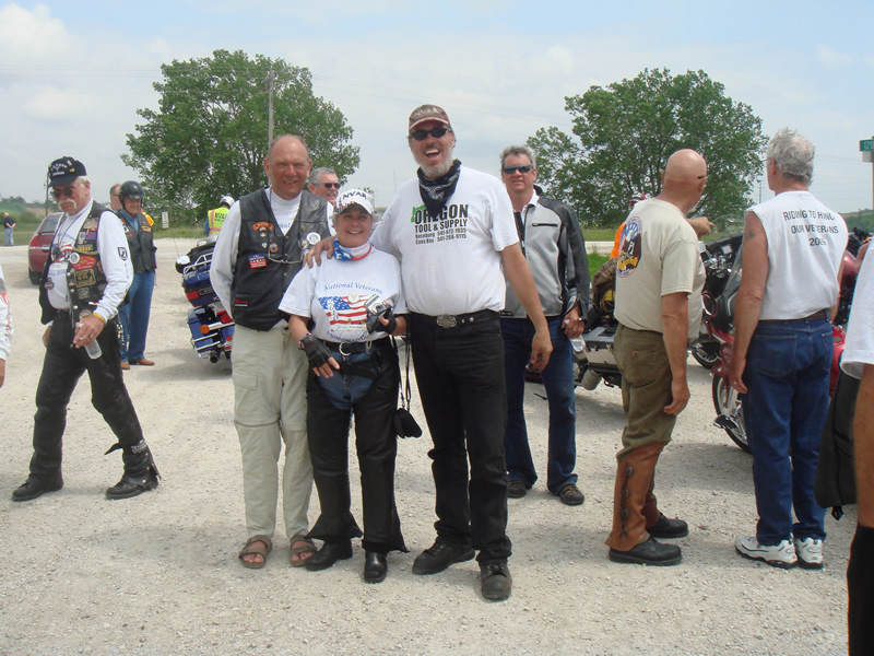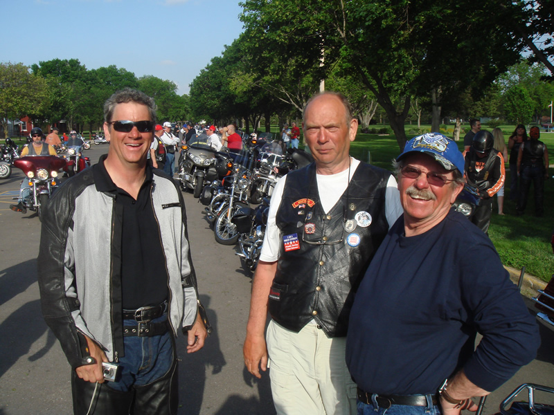 88 miles later was the next fuel stop and the weather was very good. We picked up quite a few more riders there and 65 miles later we arrived at Bayless Park in Council Bluffs, Iowa, where we were greeted by a lot more riders and a lot of town folks who were really glad to see me and the Ratbike again. As soon as I got off my bike a guy came up to me and said, "You’re Milo Anderson aren't you?" I said, “Yep,” and he said, "I'm your cousin, Ken Anderson"! He was riding a ‘99 Springer Softail, and he told me that he sold a ‘53 Pan Head that he had for years. He is a college teacher in Peru, Nebraska. His uncle, Jerome (my first cousin) told him to go to my Web site and see when I will be going through Nebraska. He got the schedule from the NVAR.us website and decided to meet me. He said that the last time he saw me was in the early 60's. His grandfather, Edmund, was my dad's brother, and yet Ken is 4 years older than me. Ken said he will be in Woonsocket, South Dakota, the Tuesday after Memorial Day for an impromptu family reunion, so I can see some more relatives that I don't know I have! My sister, brother in law, and my brother will meet there too. It falls right into place for my return trip home.